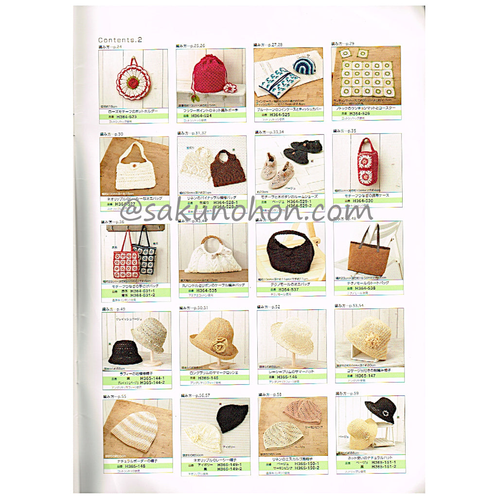 ローズモチーフのポットホルダー フラワーポイントのネット編みポーチ ブルートーンのコインケースとティッシュカバー ノトックのランチョンマットとコースター ネオリップルのレーシーなミニバッグ リネンのパイナップル模様バッグ モチーフと木ボタンのルームシューズ モチーフつなぎの携帯ケース モチーフつなぎの手さげバッグ 丸ハンドルとリボンのケーブル編みバッグ テクノモールのミニバッグ テクノモールのトートバッグ