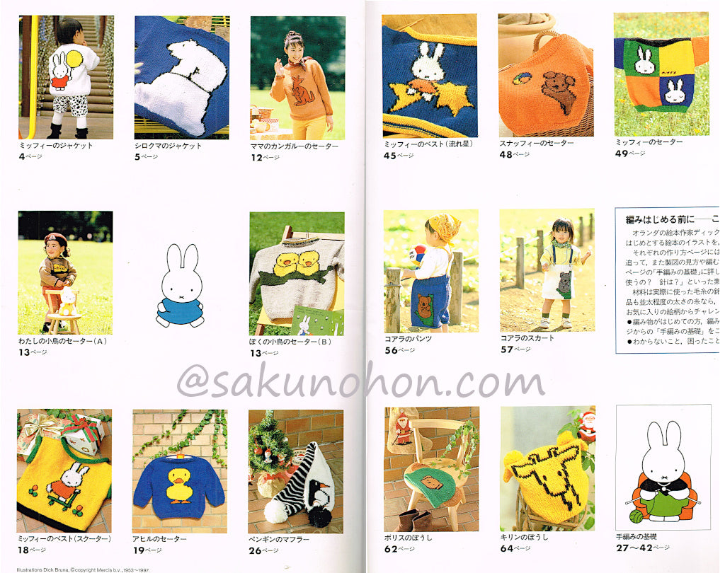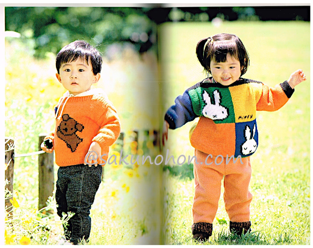 オランダの絵本作家ディック・ブルーナさんの、ミッフィーをはじめとする絵本のイラストを、セーターなどに編み込みました。材料は実際に使った毛糸の銘柄を紹介していますが、どの作品も並太程度の太さの糸なら、種類を問わず作れます。さあ、 お気に入りの絵柄からチャレンジしてみましょう。
