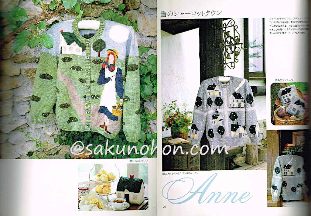 ◆「赤毛のアン」の世界をニットで表現。登場人物やグリーン・ゲイブルズのイメージをセーターやカーディガン、小物や編みぐるみに。#古書朔の本