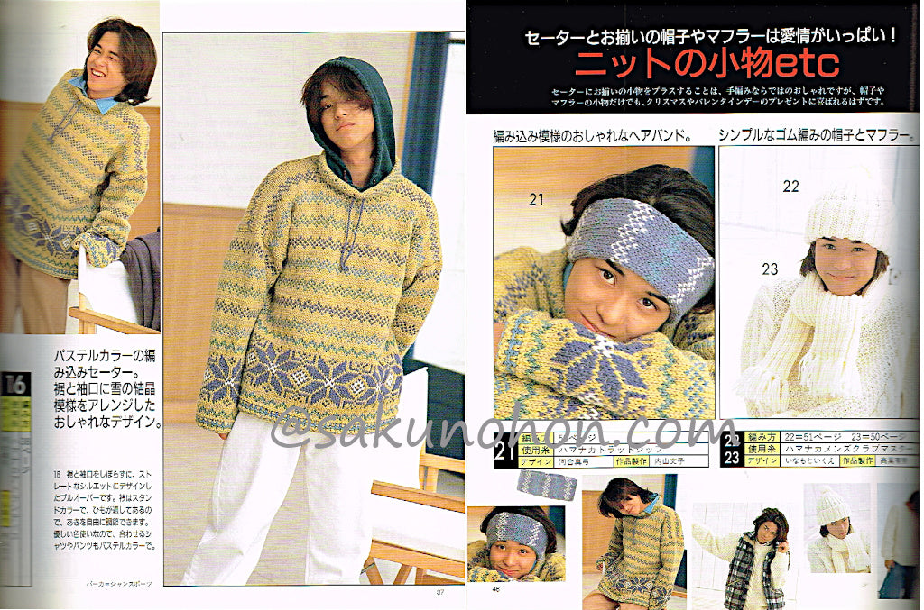 シンプルセーター(タートルネックセーター ポロシャツ風セーター ロールカラーのニット Vネックセーター フード付きパーカー 他)/配色のセーター(カーディガン ハイネックの横縞プル 他)/編み込みセーター(雪の結晶模様 ノルディック柄をアレンジしたジャカード風な編み込みニット 他)/ニットの小物(ヘアバンド 帽子とマフラー ニットキャップ プチマフラー)/縄編みのセーター(衿付きのカーディガン アラン模様 ロールネックのセーター 他)