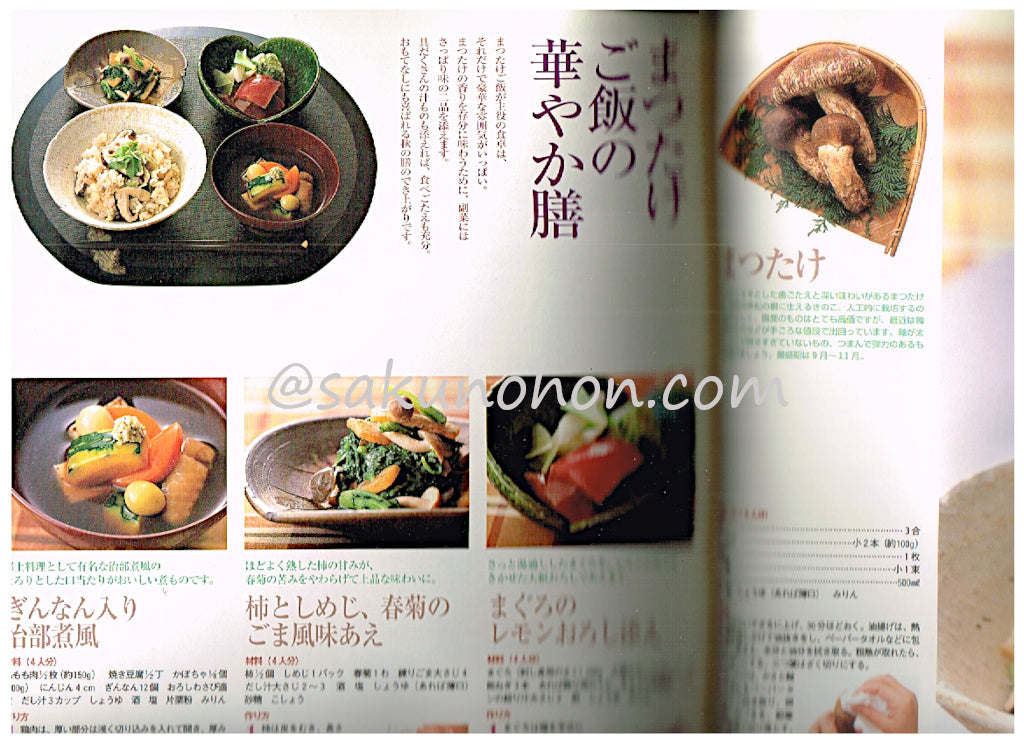◆【旬を味わう季節のめぐみたっぷりご飯】○秋のめぐみのご飯(まつたけご飯、まいたけと帆立てのご飯、磯の香りご飯、栗ご飯、さつまいもご飯、里いもとぎんなんのご飯)/○冬のめぐみのご飯(かきご飯、ゆずずし、鶏肉入り七草がゆ、たらと明太子の雑炊)/○春のめぐみのご飯(たけのこご飯、桜ご飯、青豆ご飯、鯛ご飯)/○夏のめぐみのご飯(かつおの手こねずし、冷や汁、ささ身と青じその汁かけご飯、えびとみょうがの梅風味ご飯)
